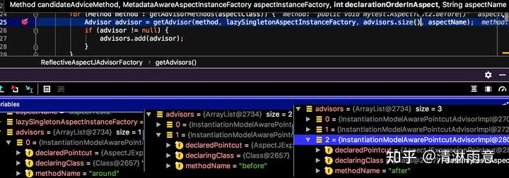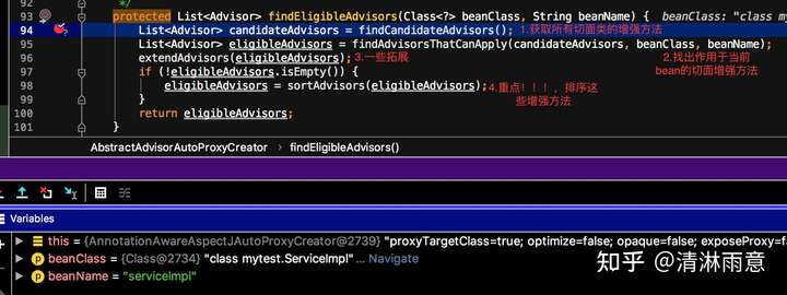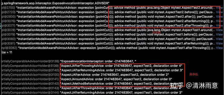 提示:写到这里其实已经“大概”验证了文章开头的结论,只是AnnotationAwareOrderComparator排完序后还有一段排序逻辑,会有点绕,而且要结合各个增强方法里的具体逻辑,但是最终呈现出的结果和上面排完序后其实一样,感兴趣的同学可以加把劲,继续看完,相信会对你大有裨益!!
