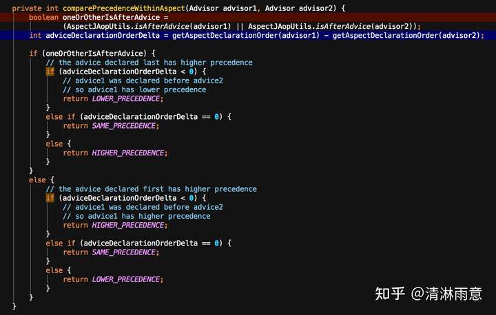 当通过AnnotationAwareOrderComparator比较完后,如果两个增强方法顺位相等且是一个切面类Aspect里的,则调用comparePrecedenceWithinAspect方法