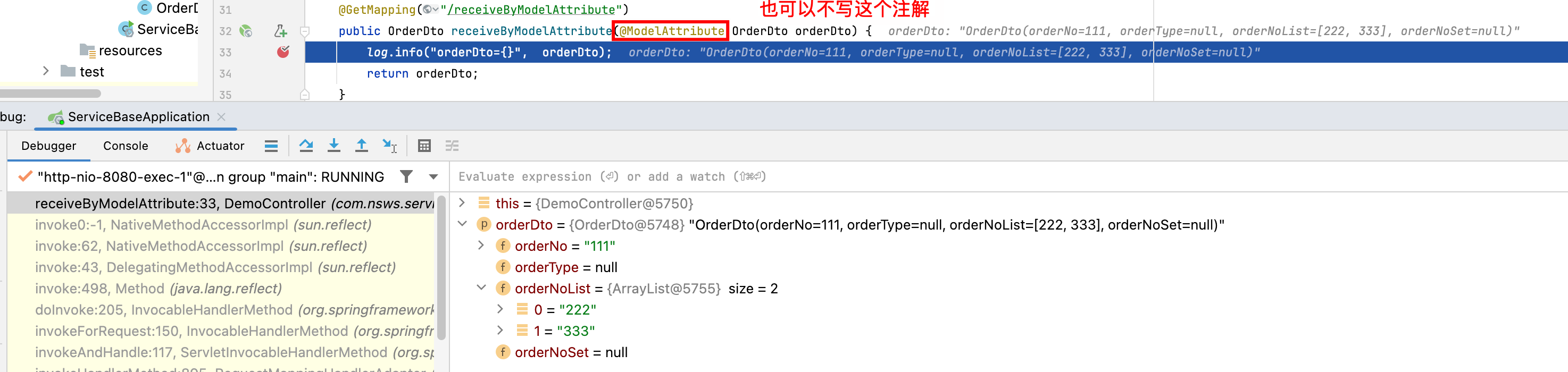 // receiveByModelAttribute?orderNo=111&orderNoList=222&orderNoList=333 @GetMapping("/receiveByModelAttribute") public OrderDto receiveByModelAttribute(@ModelAttribute OrderDto orderDto) { log.info("orderDto={}", orderDto); return orderDto; }