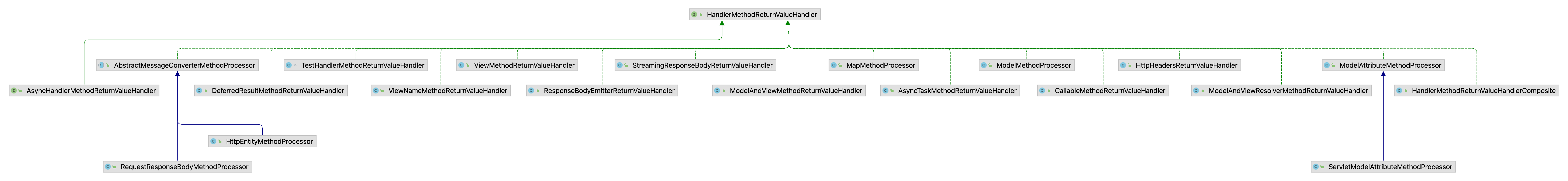 实现类中有一个特殊的类,那就是 HandlerMethodReturnValueHandlerComposite,它和前面说的 HandlerMethodArgumentResolverComposite 功能相同,自己不具体处理返回值,而是使用内部封装的组件进行处理。其他实现类都和具体返回值类型相对应。