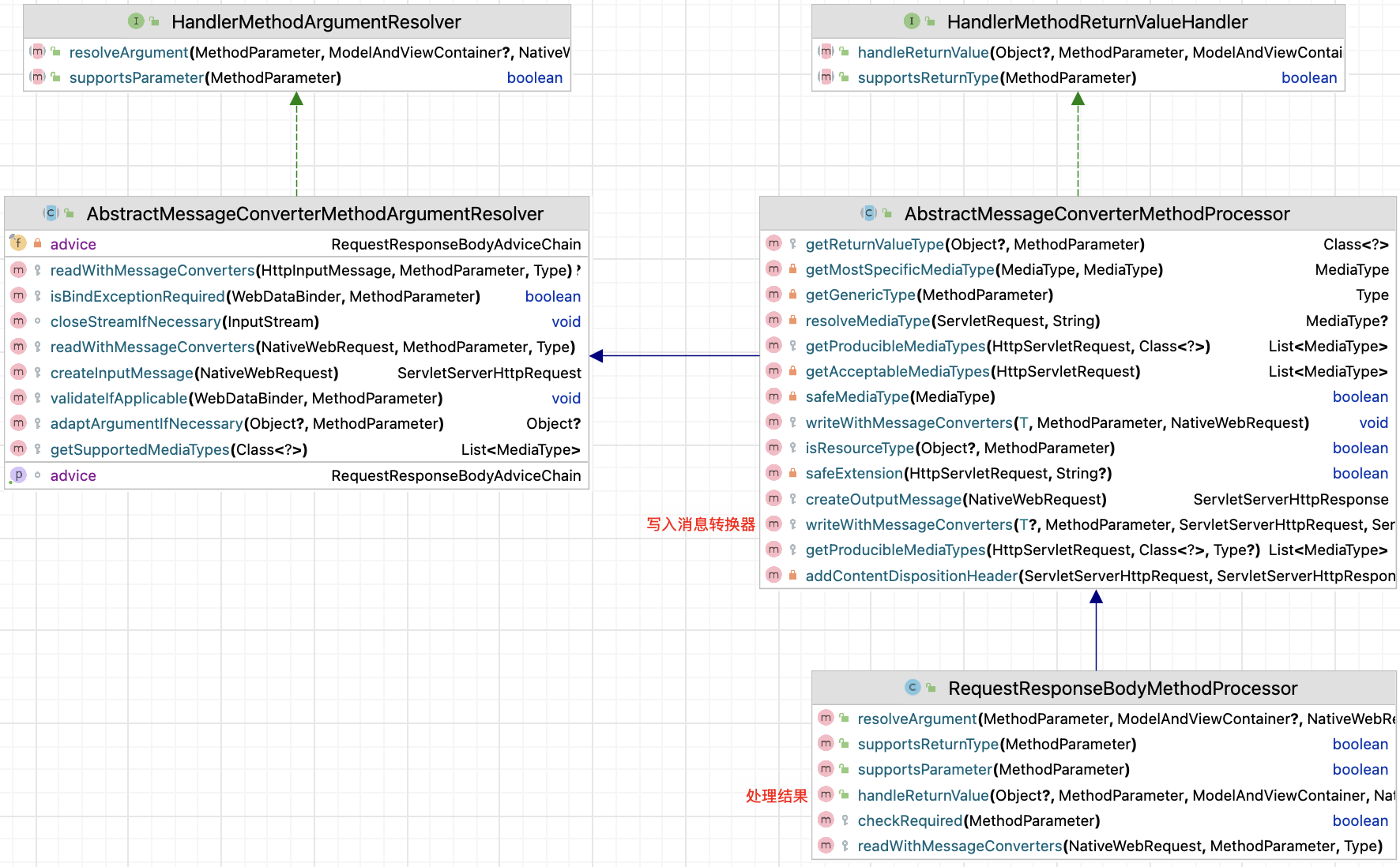 首当其冲的必须是我们现在常用的 RequestResponseBodyMethodProcessor,他的类图如下: