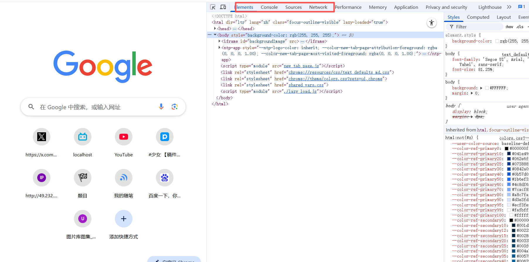 如图中圈出的所示,我们主要使用的是Elements、Console、Sources以及Network。