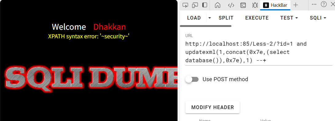- 根据返回的错误,如“XPATH syntax error:'~security~'”提取到当前的数据库为security。