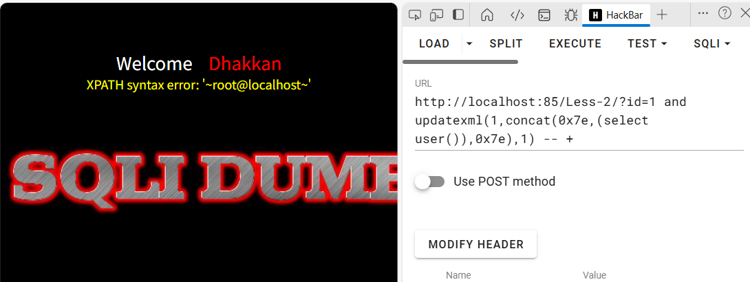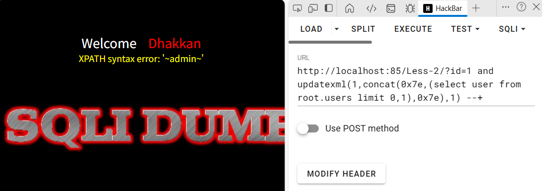 于是乎我们可以通过updatexml函数进行报错注入,首先需要判断当前的用户名和所在数据库,通过查询语句