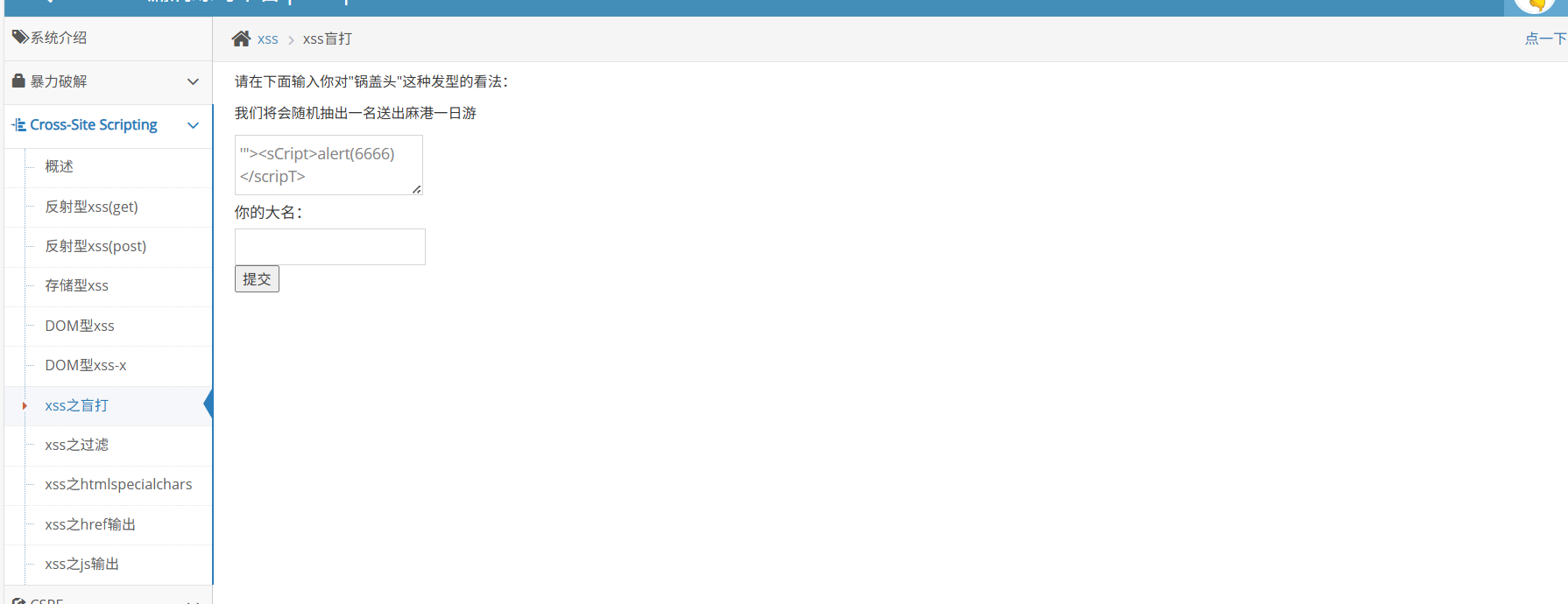 XSS 盲打就是攻击者在前端提交的数据不知道后台是否存在XSS 漏洞的情况下,提交恶意JS 代码在类似留言板等输入框后,所展示的后台位置的情况下,网站采用了攻击者插入的恶意代码。当后台管理员在操作时就会触发恶意代码,从而达到攻击者的目的。