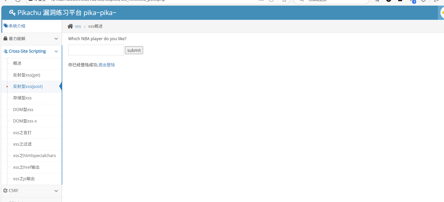打开网站后,首先利用<script>alert(/xss/)</script>进行判断。但我们在对话框上输入后点击提交发现发生回显说明产生XSS漏洞。接下来便可以构造恶意脚本,例如<script>alert(document.cookie)</script>来获取cookie值。·