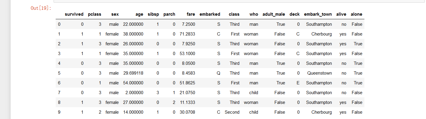 titanic = pd.read_excel('C:/Users/cookie/Desktop/数据文件/titanic.xlsx') titanic['age'] = titanic['age'].fillna(titanic['age'].mean()) titanic['deck'] = titanic['deck'].fillna(0) titanic['embarked'] = titanic['embarked'].fillna(0) titanic.head(10)