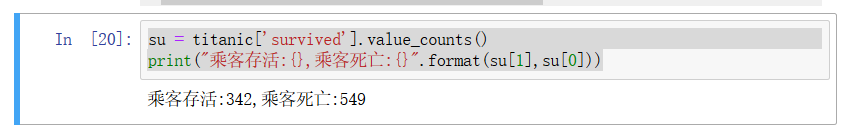 print("乘客存活:{},乘客死亡:{}".format(su[1],su[0]))