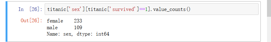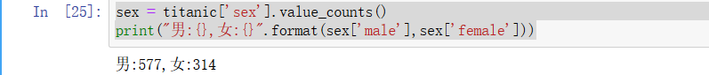 sex = titanic['sex'].value_counts() print("男:{},女:{}".format(sex['male'],sex['female']))