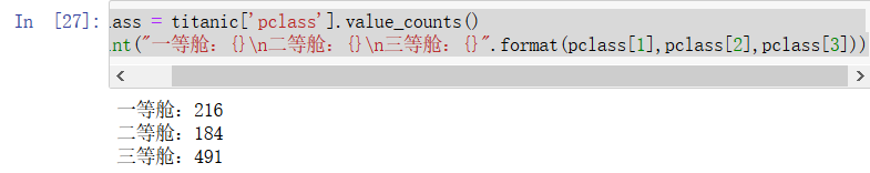 pclass = titanic['pclass'].value_counts() print("一等舱:{}\n二等舱:{}\n三等舱:{}".format(pclass[1],pclass[2],pclass[3]))