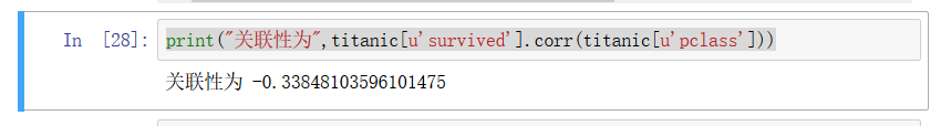 print("关联性为",titanic[u'survived'].corr(titanic[u'pclass']))