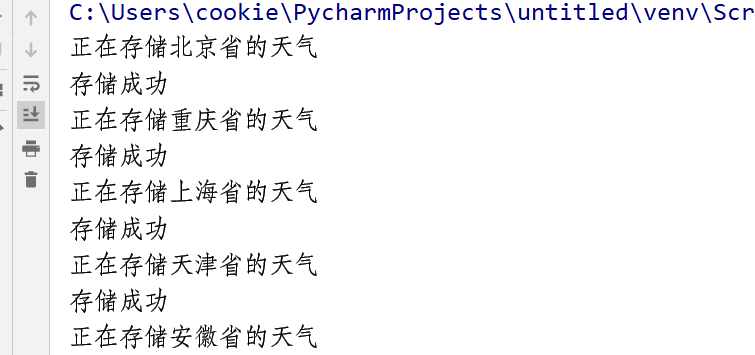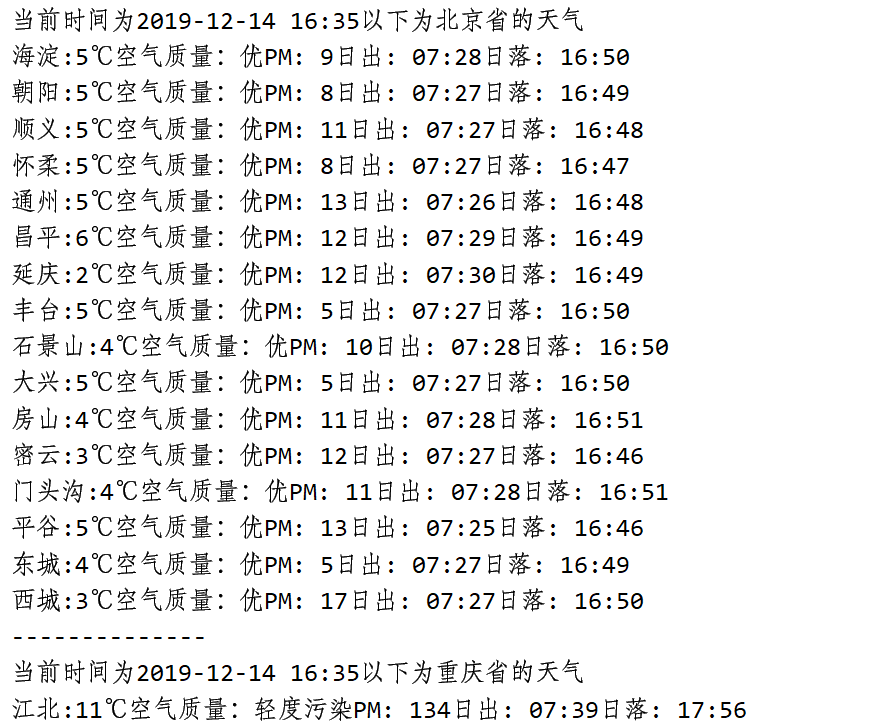 def getCityWeather(dic,dic2): nowTime = time.strftime("%Y-%m-%d %H:%M", time.localtime()) for into in cityProvinceList: print("当前时间为{}以下为{}省的天气".format(nowTime,into)) for x in dic.get(into): url = "https://www.tianqi.com/" + x html = getHtml(url) print(dic2.get(x) + ":" + getTemperature(html), end="") print(getWeather(html)) print("--------------")