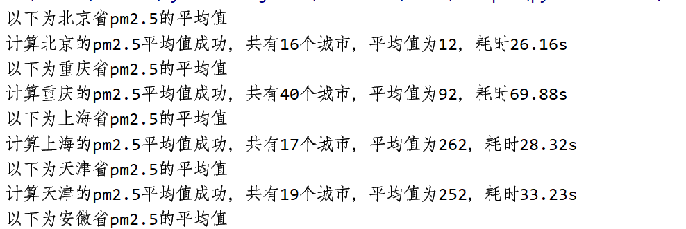 def getCityPM(cityProvinceList,dic): pmList = [] #存放各省的平均pm2.5 pm = 0 #pm2.5累加 num = 0 #计数 for into in cityProvinceList: print("以下为" + into + "省pm2.5的平均值") for x in dic.get(into): start_time = time.time() #记录当前时间 url = "https://www.tianqi.com/" + x html = getHtml(url) pm = pm + getPm(html) num += 1 avePm = round(pm/num) pmList.append([into,avePm]) elapse_time = time.time() - start_time print("计算{}的pm2.5平均值成功,共有{}个城市,平均值为{},耗时{}".format(into,num,avePm,elapse_time)) num = 0 #计数归0一下 return pmList