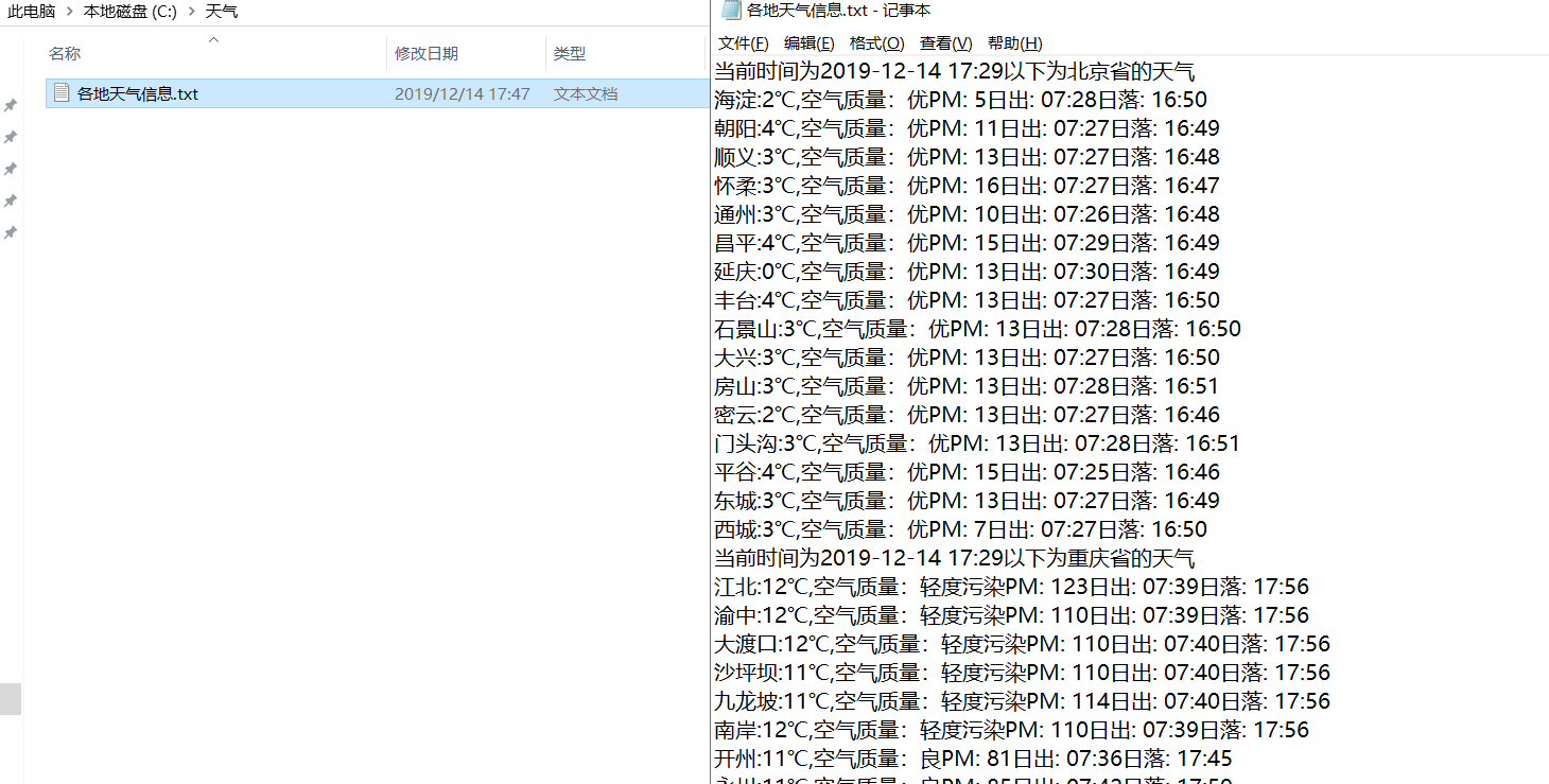 #获取所有地方的天气 def getCityWeather(dic,dic2): nowTime = time.strftime("%Y-%m-%d %H:%M", time.localtime()) for into in cityProvinceList: # 数据保存 dataSave() try: # 创建文件用于存储爬取到的数据 with open("C:\\天气\\各地天气信息.txt", "a") as f: f.write("当前时间为{}以下为{}省的天气\n".format(nowTime,into)) except: "存储失败" print("正在存储{}省的天气".format(into)) for x in dic.get(into): url = "https://www.tianqi.com/" + x html = getHtml(url) try: # 创建文件用于存储爬取到的数据 with open("C:\\天气\\各地天气信息.txt", "a") as f: f.write("{}:{},{}\n".format(dic2.get(x),getTemperature(html),getWeather(html))) except: "存储失败" print("存储成功")