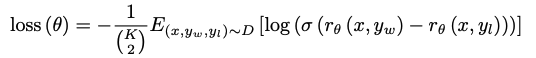 2. RM模型(reward model):用gpt生成多个答案之后,由人来排序,然后训练了一个排序模型,并且fix下来。由于排序是一个非常specific的简单工作,因此这个模型不需要很大,但效果可以很好。这个模型实际上模拟的是人类标注员对于答案的preference,比如bias,toxic,faireness。这个模型的训练其实是为了第三部的RL做准备的。从下面的loss看到,就是一个比较经典的learning to rank。