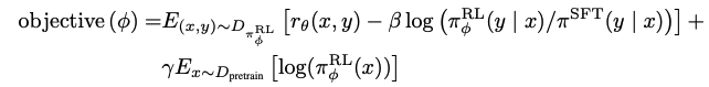 3. PPO:PPO是RL的其中一种方法。训练loss其实很简单,即把gpt作为policy model,而把第二步的human ranking proxy作为reward model,来提供实时的feedback,使得RL可行。训练过程即:a. 从SFT来boostrap模型。b.给定任务x,让gpt生成答案y,并由RM给一个反馈。loss的后面部分是让RL训练的模型和原始的SFT不要差距太大,以防RM算不准,因此用了一个KL divercence来控制;并且为了保证泛化性能,在最后还是补上了pretrain loss。