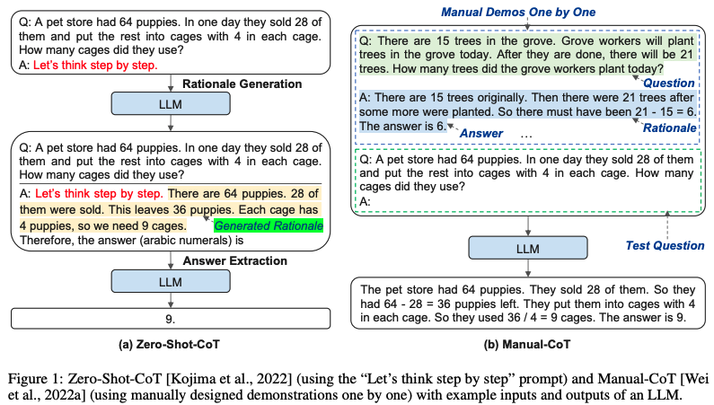 Chain of thought是解放LLM的一个探索方向。比如用Let's think step by step,放在prompt的前面。这样LLM就会一步一步地将模型的推理过程generate出来,这对于模型进行reasoning是至关重要的。因为很多情况下,一个复杂的问题让模型直接给出答案,它可能只能胡扯,但是在step by step的prompt的情况下,模型是要保证每一步的答案都是合乎逻辑的,并且后面生成的话也是要跟前面的逻辑自洽(auto-regression+attention的作用),使得模型用了更多的算力(思考时间)来生成答案,因此模型更加可能进行合理的reasoning。具体而言,有两种方法: