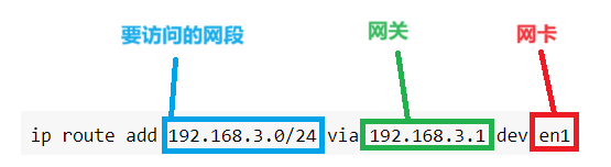 你需要将网卡为en1,IP地址为192.168.3.12,网关为192.168.3.1 的路由策略设置为在访问192.168.3.0/24 网段时走en1网卡,那么你可以通过下面的命令设置: