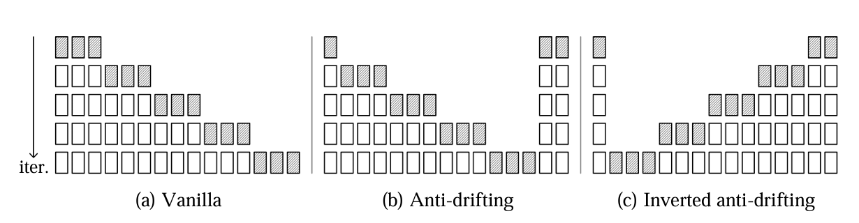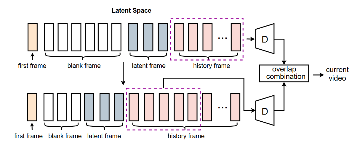 图(a)给出了传统的自回归生成范式,随着序列的生成,模型会出现漂移现象,降低生成帧质量。作者认为,首先生成尾帧能够缓解这一现象。较先生成的帧的误差累计相对较小,能够缓解漂移现象,该过程对应于图(b)。此外,作者还提出了anti-drifting采样方式,将视频由后向前生成,对应于图(c)。对于I2V(Image-to-video)任务,首帧质量较高,因此,由后向前生成视频时,靠近首帧的帧虽较晚生成但受首帧的影响更大,进一步减缓了漂移现象。