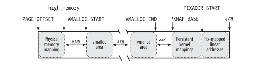 这种模式主要是避免了外碎片,而缺点是打乱了内核页表。显然,非连续内存区的大小必须是4096的倍数。Linux在几个地方使用非连续内存区,例如,为活动的交换区分配数据结构,为模块分配空间(linux驱动模块),或者给某些I/O驱动程序分配缓存。
