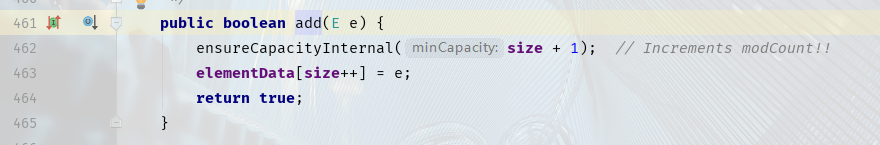 public boolean add(E e) { modCount++; add(e, elementData, size); return true; }