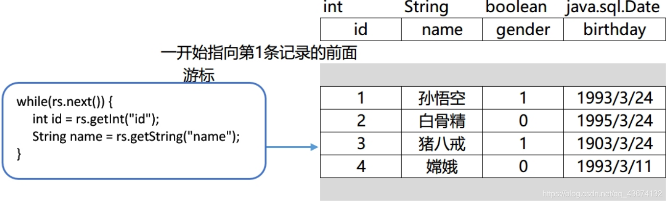 - 如果光标在第一行之前,使用 rs.getXX()获取列值,报错:Before start of result set