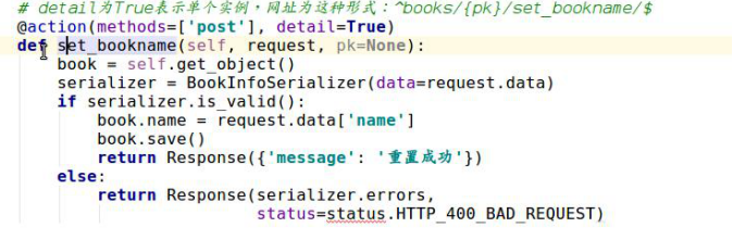 class BookInfoViewSet(mixins.ListModelMixin, mixins.RetrieveModelMixin, GenericViewSet): queryset = BookInfo.objects.all() serializer_class = BookInfoSerializer @action(methods=['get'], detail=False) def latest(self, request): ... @action(methods=['put'], detail=True) def read(self, request, pk): ...