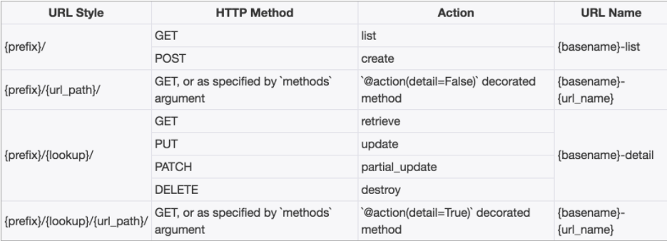 - detail: 表示是action中要处理的是否是视图资源的对象(即是否通过url路径获取主键)