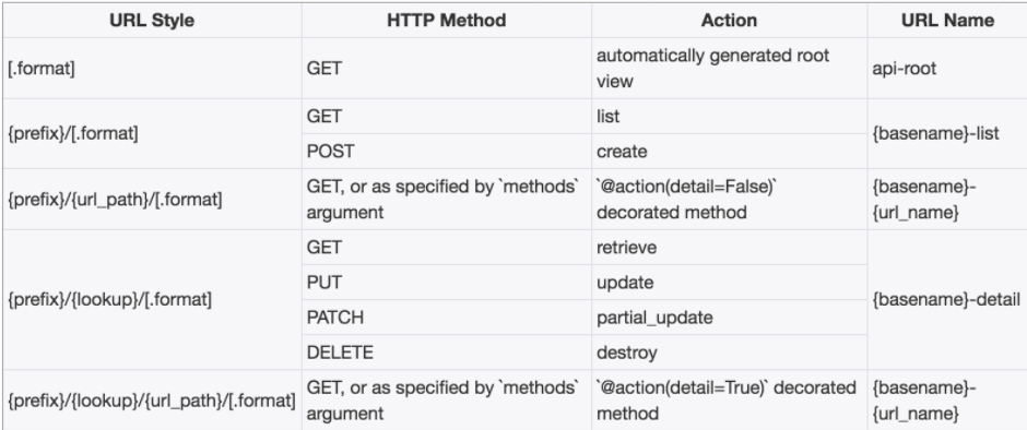 class BookViewSet(viewsets.ViewSet): def list(self, request): pass def create(self, request): pass def retrieve(self, request, pk=None): pass def update(self, request, pk=None): pass def partial_update(self, request, pk=None): pass def destroy(self, request, pk=None): pass