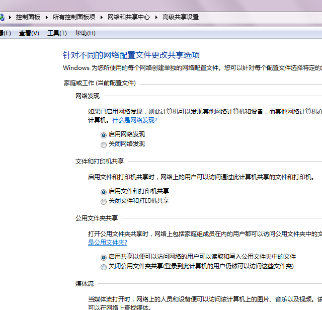 不能启动时看下services.msc里的下面几个服务启动没有,主要还是设置了共享的那台电脑,把它的网络设置为“工作网络”好点,不要“公用网络”,