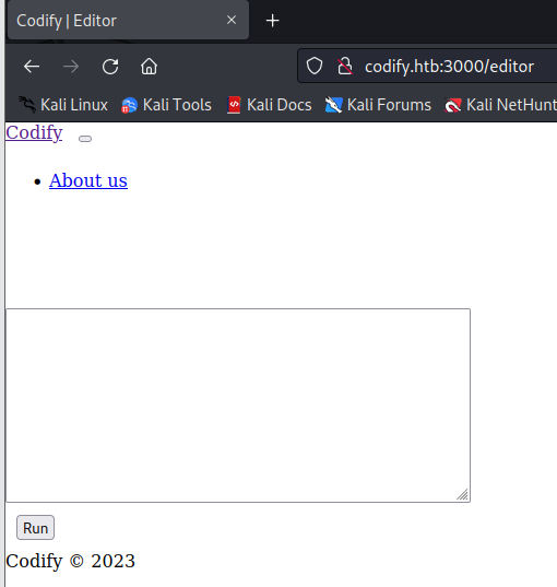 └─$ nmap -sV 10.10.11.239 Starting Nmap 7.93 ( https://nmap.org ) at 2023-11-17 15:58 HKT Nmap scan report for codify.htb (10.10.11.239) Host is up (0.31s latency). Not shown: 983 closed tcp ports (conn-refused) PORT STATE SERVICE VERSION 22/tcp open ssh OpenSSH 8.9p1 Ubuntu 3ubuntu0.4 (Ubuntu Linux; protocol 2.0) 80/tcp open http Apache httpd 2.4.52 100/tcp filtered newacct 119/tcp filtered nntp 1021/tcp filtered exp1 1045/tcp filtered fpitp 1455/tcp filtered esl-lm 2522/tcp filtered windb 2967/tcp filtered symantec-av 3000/tcp open http Node.js Express framework 3030/tcp filtered arepa-cas 5631/tcp filtered pcanywheredata 5904/tcp filtered ag-swim 9944/tcp filtered unknown 14000/tcp filtered scotty-ft 15000/tcp filtered hydap 56738/tcp filtered unknown Service Info: OS: Linux; CPE: cpe:/o:linux:linux_kernel Service detection performed. Please report any incorrect results at https://nmap.org/submit/ . Nmap done: 1 IP address (1 host up) scanned in 47.80 seconds
