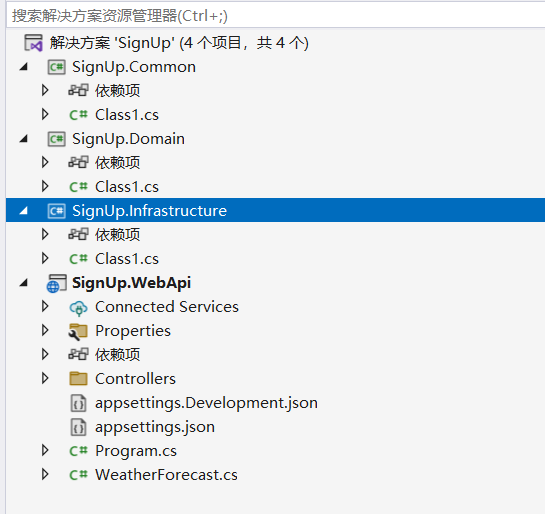 然后再创建SignUp.Common、SignUp.Domain、SignUp.Infrastructure三个类库项目。