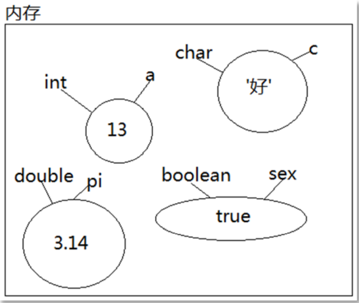 在上图当中每一个抽象的椭圆就代表一个变量,其中 a、c、pi、sex 是 4 个变量的名字(变 量名只要是合法的标识符即可),13、‟好‟、3.14、true 是 4 个变量中分别存储的数据(字面 量),int、char、double、boolean 是 4 个变量分别对应的数据类型(int、char、double、boolean 等都是 java 的关键字,声明变量时用来指定变量的数据类型)。