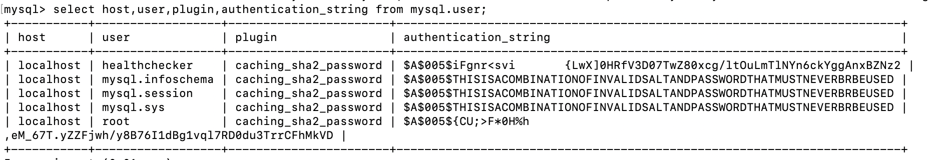 首先查询select host,user,plugin,authentication_string from mysql.user;