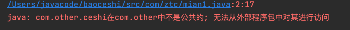 1 package com.other; 2 3 public class Publicceshi {//公开访问权限,和main类不在一个包下面 4 5 }