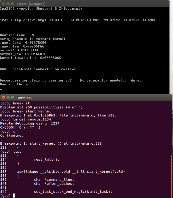 结果显示gdb可以追踪到start_kernel函数,断点在init/mian.c的538行。