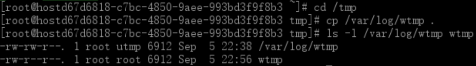 2.变换目录到/tmp,并将/var/log/wtmp 复制到/tmp观察属性