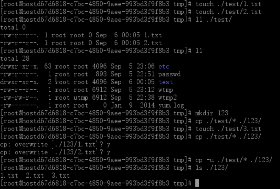 这里为了测试,先在/tmp/test 目录下新建1.txt,2.txt两个文件,将其复制到/tmp/123目录中,然后再次在/tmp/test 目录下新建3.txt文件,再次复制到/tmp/123下面,分别用不加 –u参数和用-u参数做对比。
