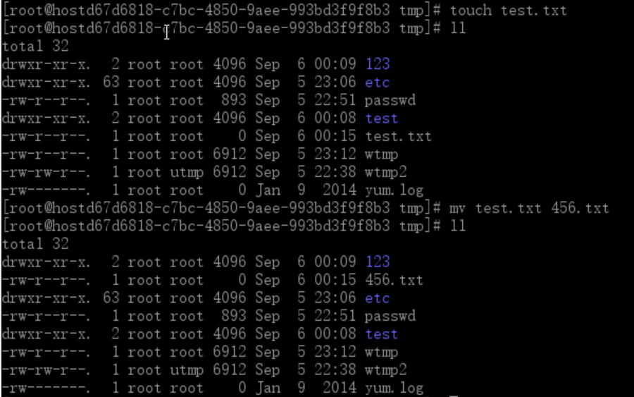 切换到/tmp 目录下,用touch新建一个test.txt,然后用mv 重命名为456.txt