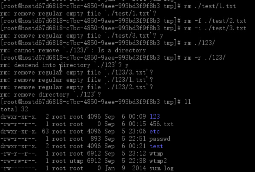 例:删除我们之前在/tmp/test目录下新建的1.txt ,2.txt,3.txt 和/tmp/123目录,分别用以上不同的参数